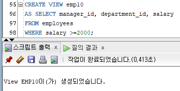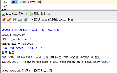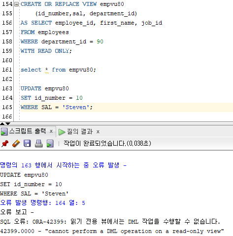 위와 같이 WITH READ ONLY를 사용하면 읽기 전용 뷰에서는 DML 작업을 수행할 수 없다는 오류가 뜸.