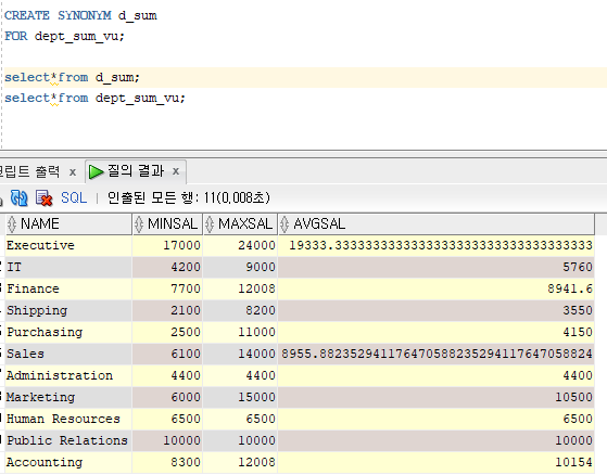 CREATE SYNONYM +시노님 이름+ FOR 객체이름;