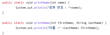메소드 명이 같아도, 매개변수 개수 또는 타입이 다르면 같은 이름을 사용해서 사용해서 메소드를 정의할 수 있음.
