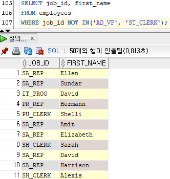 위의 예시는 AD_VP와 ST_CLERK를 제외한 값들만 출력되는 것을 알 수 있습니다.