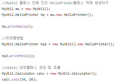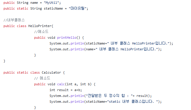 * MyUtil의 경우 static을 쓰지 않아 myutil클래스를 생성했을 때 선언한 HelloPrinter만 사용 가능함.