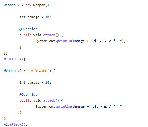 위의 예시는 Weapon이라는 인터페이스를 통해 구현한 익명클래스임.