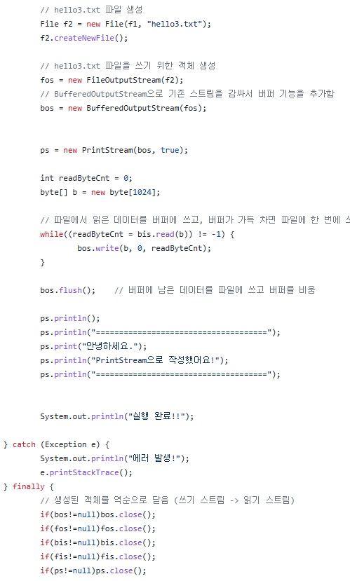 | BufferedOutputStream(OutputStream Out) | OutputStream에 대한 BufferedOutputStream 객체 생성 |